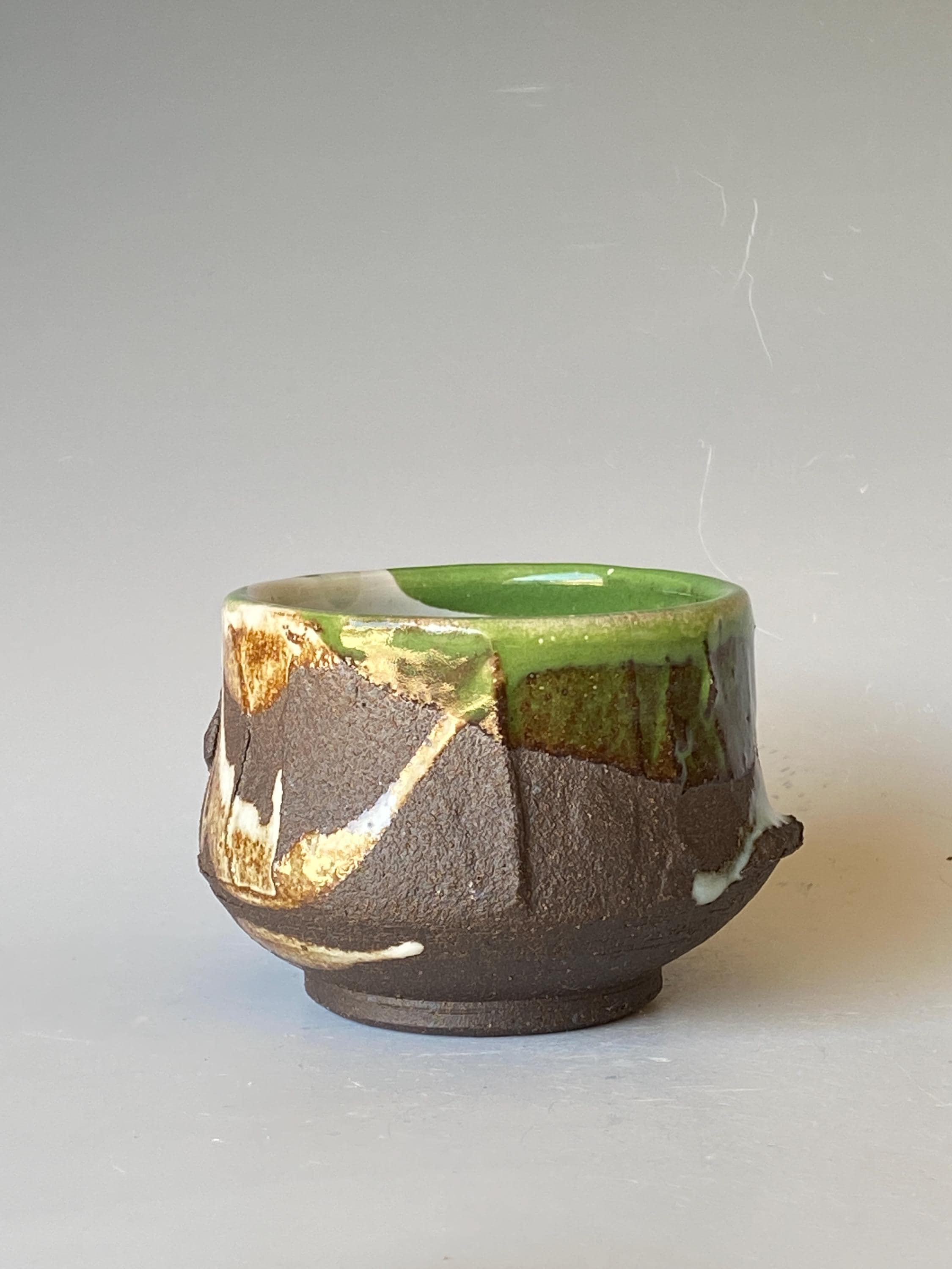In these series of tea bowls and cups I used a dark clay that called black mountain. Part of outer surface of these bowls left un-glazed to show the color and texture of fired clay without any glaze.